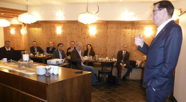 Als Gastreferent war der Gastgeber, Hotelier Andreas Züllig, Präsident Hotelleriesuisse eingeladen. Er sprach zum Thema „Herausforderungen und Chancen im Alpenraum“. Er zeigt unter anderem auf, dass eine grosse Schere in der Entwicklung zwischen Stadt- und Bergregionen besteht, dass die Gäste immer weniger Lang verbleiben und dass die Frankenstärke massive Auswirkungen für die Hotellerie zur Folg hatte. Eindrücklich waren auch die Aussage, dass der Kanton Graubünden seit 2008 rund 1,4 Millionen oder 22% Logiernächte verloren hat. Diese Rückgänge sind mehr oder weniger parallel zum Wechselkurs des Euro verlaufen. Er nahm auch Stellung zu den klimatischen Veränderungen sowie zu den strukturellen Herausforderungen. Die Nachteile des alpinen Raumes seien, die periphere Lage, die hohen Infrastrukturkosten, die geringe Wertschöpfung sowie das niedrige Wachstum.